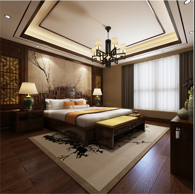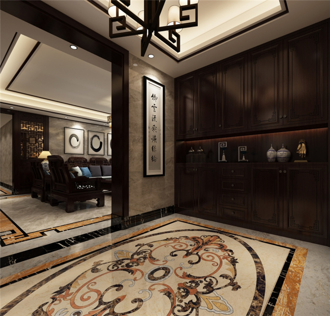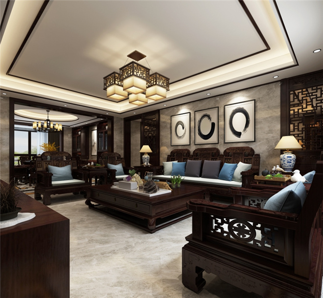 客厅部分客厅去掉了常规复杂的中式风格装修背景墙,采用明亮大气石材和水墨画结合的形式。名匠装饰家装设计效果图