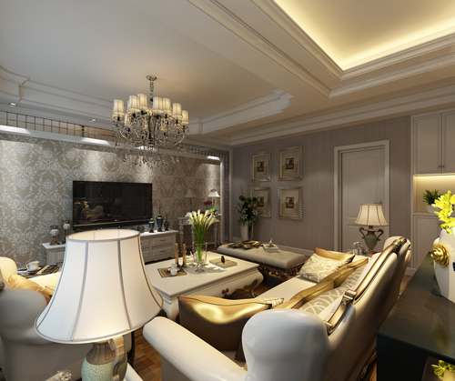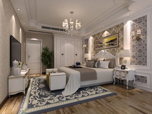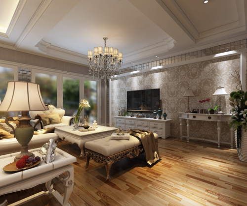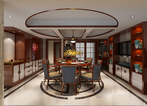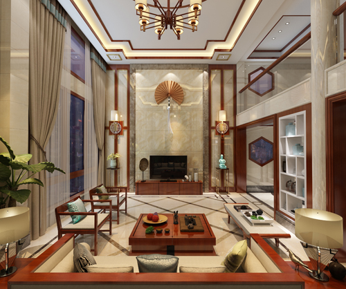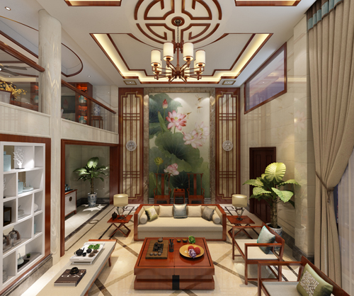 色彩以深色沉稳为主。因中式家具色彩一般比较深,这样整个居室色彩才能协调。再配以红色或黄色的靠垫、坐垫就可烘托居室的氛围,这样也可以更好的表现古典家具的内涵。名匠装饰装修效果图