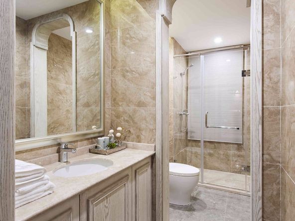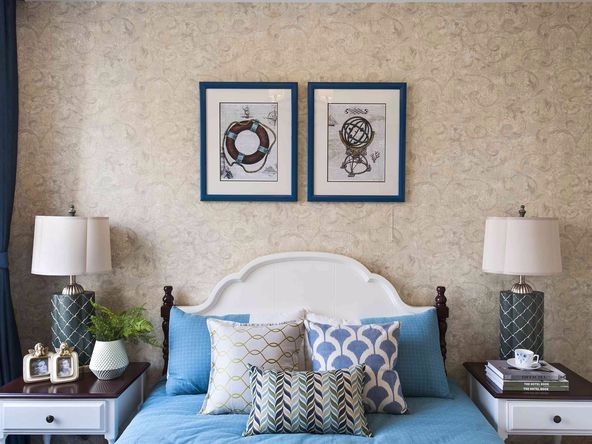 本案中梁与背景墙的截面设计成矩形,数根梁的组合与穿插形成富有结构的韵律。瓷砖上选择了海浪纹理和黄褐色,壁纸与地砖呼应、配饰方面选择海洋的饰品装饰空间以及小装饰品的点缀。所有元素结合起来是富有变化和层次的,仿佛置身于广阔的海洋中,名匠装饰家居装修效果图