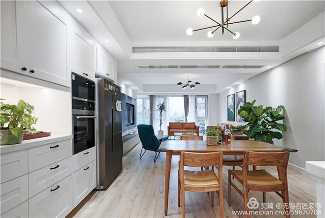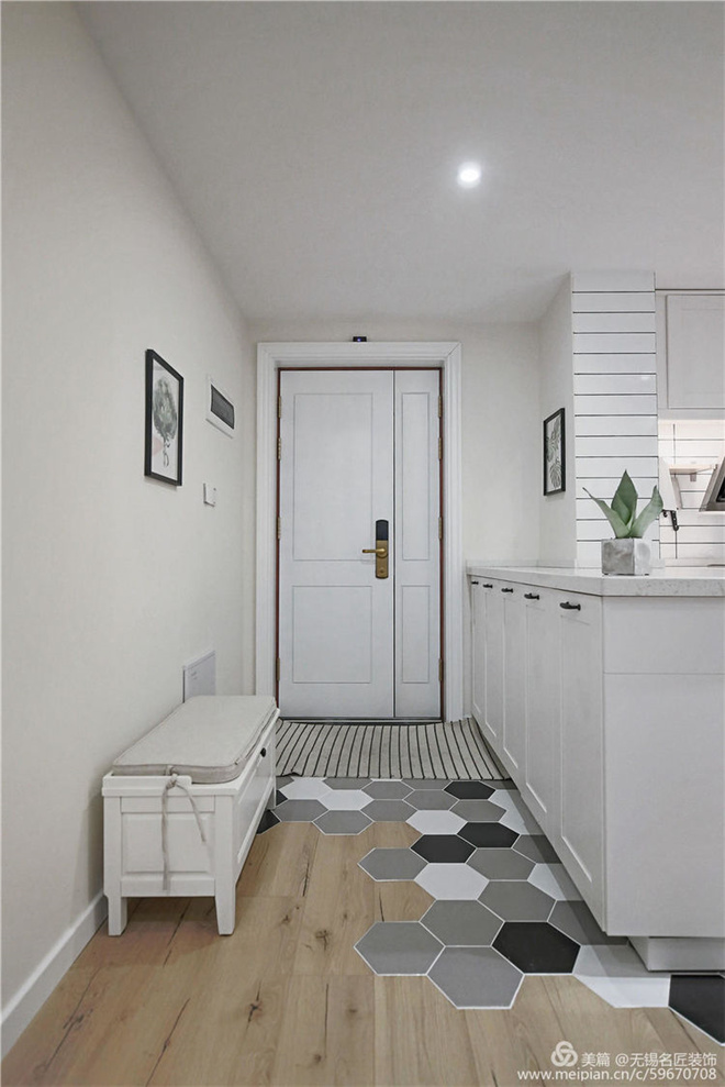 1、封闭进入生活阳台的门,将厨房与入户的墙体拆除,厨房形成“U”型橱柜,扩大进门的视觉空间。