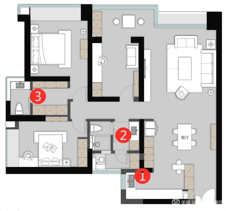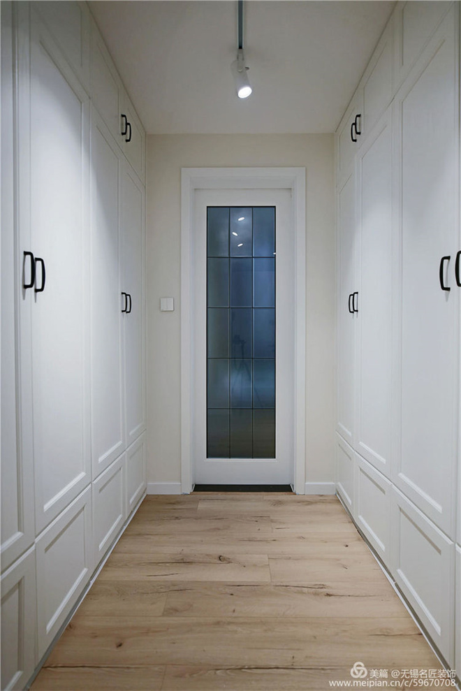3、将主卫面积缩小,扩大衣帽间的空间,形成双排衣柜以及一个无淋浴的卫生间。