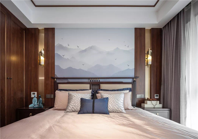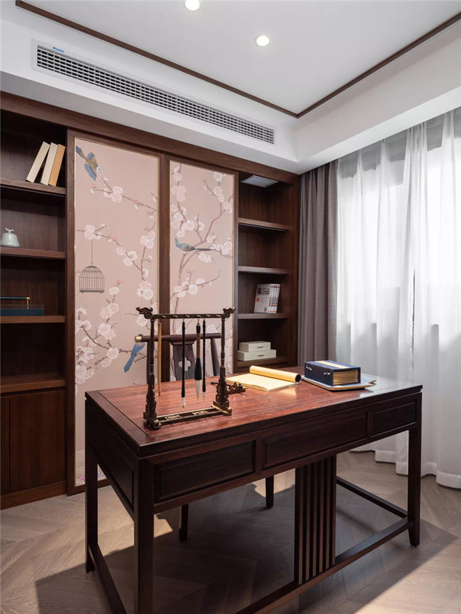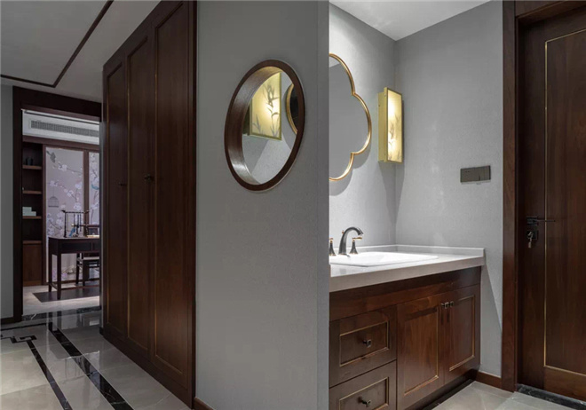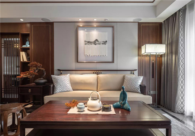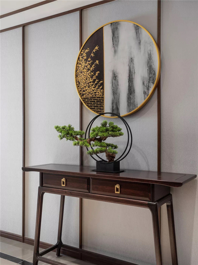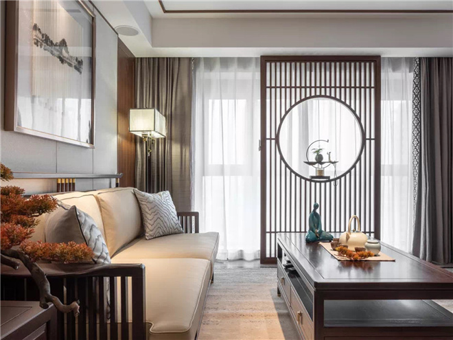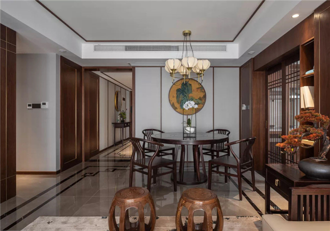 这是一套140平米的新中式风格装修案例,整体以古韵的中式设计元素,墙面的木质饰面板+金属线条装饰,还有实木的中式家具布置,细节里禅意精致的圆形造景设计,也让空间显得更加端庄档次。